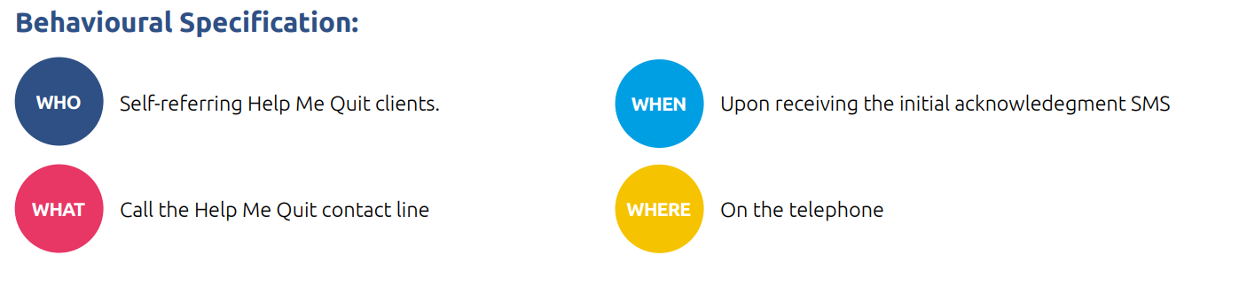 An example of how BeSci was applied in practice comes from the Help Me Quit Smoking Cessation Service. Communication to some clients who self-refer to Help Me Quit is done via SMS message. The SMS aims to prompt clients to engage with support services after they initiated a self-referral via the website. Engagement data showed that only 5% of clients who received the original SMS called the service on Day 0. Overall, the rate for successful contact from those that self-referred was 30%. Many clients did not respond to the service’s attempts to engage, likely due to the lack of an immediate call-to-action, or motivational framing. BeSci applied behavioural specification (Figure 2) to identify the who, what, when and where of the intervention.